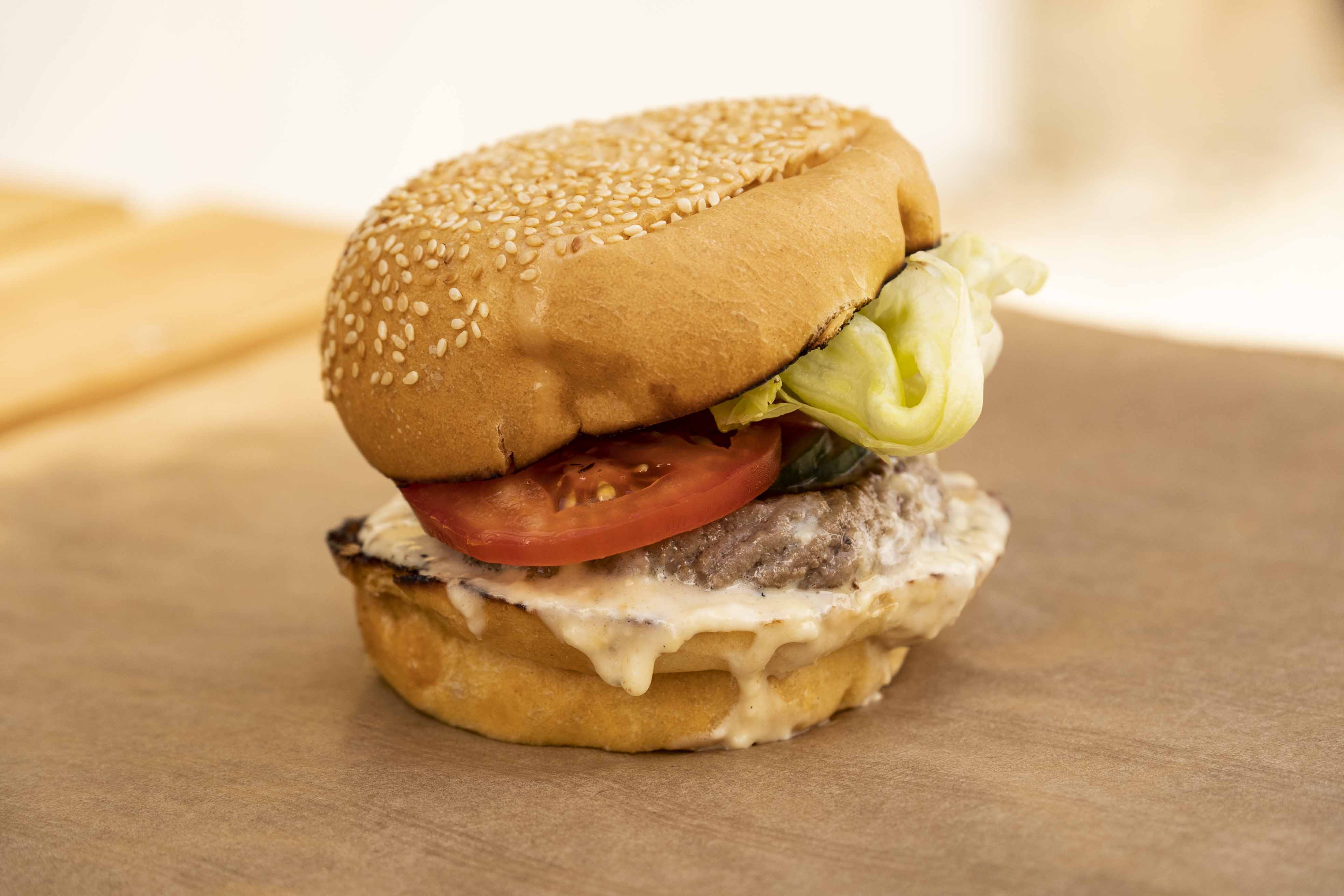 Pain blanc fait maison (farine locale), salade, tomate, basilic, big cornichon maison, steak haché minute (race à viande locale), moutarde à l’ancienne, crème de camembert maison.