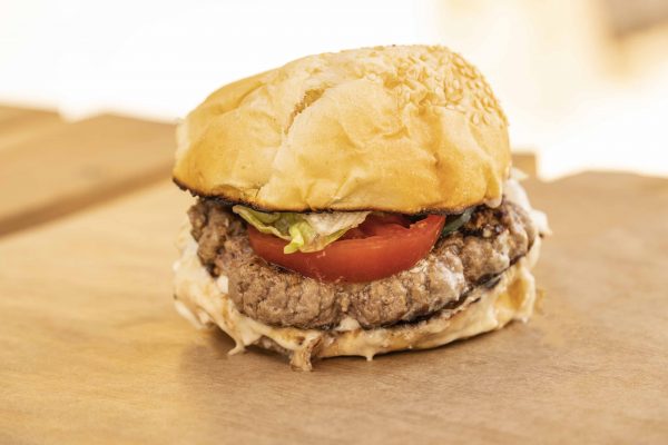 Pain blanc fait maison (farine locale), salade, tomate, basilic, big cornichon maison, steak haché minute (race à viande locale), crème de gorgonzola maison.